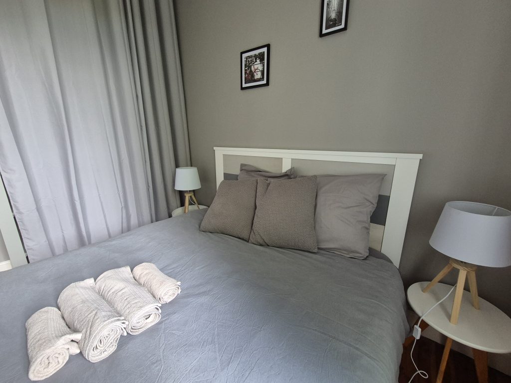 Une chambre dispose d’un accès direct au balcon, offrant une vue agréable sur le quartier.